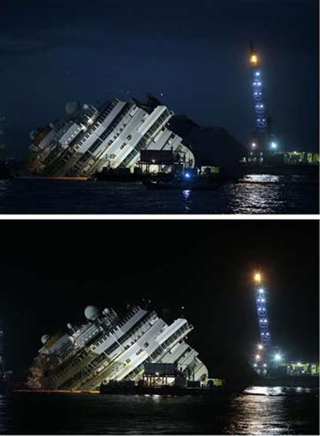 Δύο φωτογραφίες που δείχνουν τις διαφορές στο ναυάγιο πριν και μετά την επιχείρηση. Στην πάνω φωτογραφία η εικόνα του Costa Concordia το βράδυ της Κυριακής. Στην κάτω φωτογραφία το Costa Concordia με κλίση 25 μοιρών, μετά από 18 ώρες από την έναρξη της επιχείρησης ανέλκυσής του.