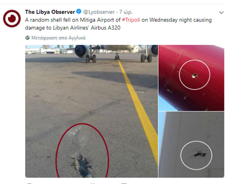 Αεροσκάφος το οποίο ήταν έτοιμο να απογειωθεί χτυπήθηκε από πυραύλους, στο αεροδρόμιο της Τρίπολης, την ίδια ημέρα που ο απεσταλμένος των Ηνωμένων Εθνών και η πρέσβης της Γαλλίας βρίσκονταν στη Λιβύη για να συζητήσουν το ειρηνευτικό σχέδιο για τη χώρα αυτή.