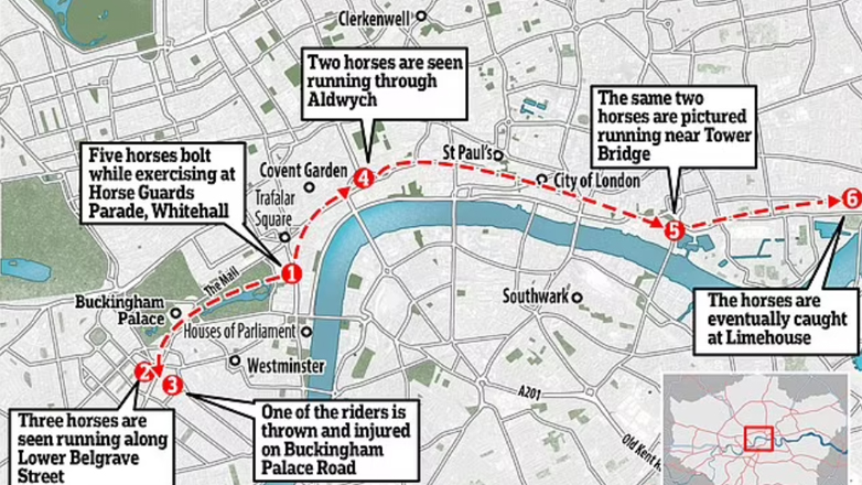 Τουλάχιστον πέντε άλογα του βασιλικού ιππικού ξέφυγαν, άγνωστο από πού, και ξεχύθηκαν στους δρόμους της βρετανικής πρωτεύουσας. Ένα από αυτά είναι καλυμμένο με αίμα χωρίς να έχει γίνει ακόμα γνωστό, πως βρέθηκε πάνω του.