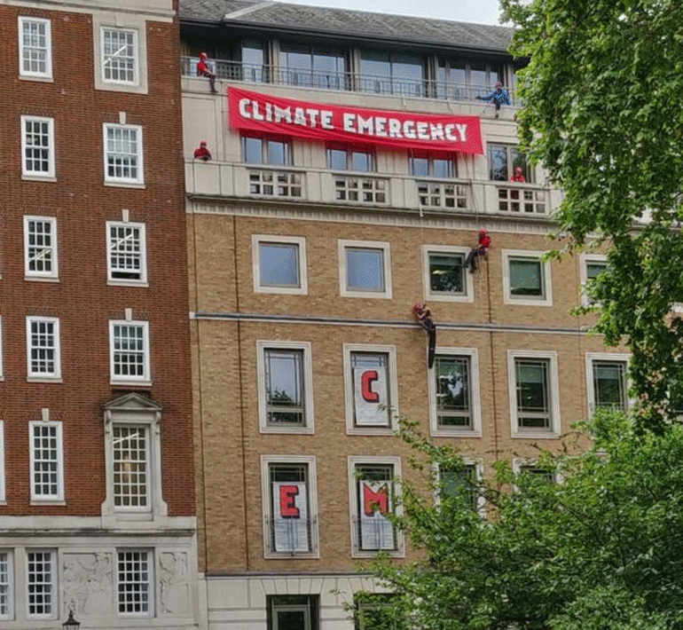 Οι ακτιβιστές απέκλεισαν το κτήριο της BP στην St James’ Square στο κεντρικό Λονδίνο στις 05:00 ώρα Ελλάδος και κλείστηκαν σε ειδικά σχεδιασμένα κοντέινερ ώστε να αποκλείουν όλες τις κεντρικές εισόδους.
