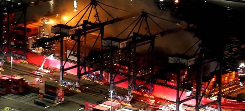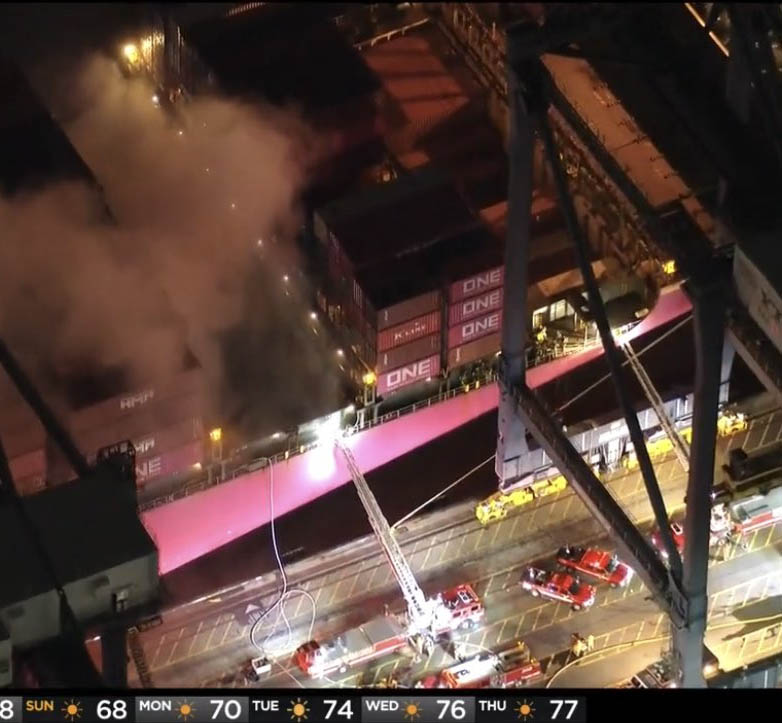 Χθες το βράδυ (21/11) ξέσπασε πυρκαγιά στο λιμάνι Σαν Πέτρο του Λος Άντζελες. Φαίνεται ότι την πυρκαγιά την προκάλεσε έκρηξη σε εμπορικό πλοίο. Λόγω της πυρκαγιάς διακόπηκε η ηλεκτροδότηση και η λειτουργία των γερανών, ενώ όλα τα μέλη του πληρώματος απομακρύνθηκαν με ασφάλεια από το φλεγόμενο σκάφος.