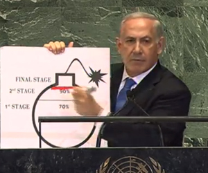 Έχοντας μαζί του ένα σκίτσο με μια βόμβα έτοιμη να εκραγεί, ο Benjamin Netanyahu εξήγησε ότι η Τεχεράνη θα μπορέσει να παράγει πυρηνικό υλικό, αρκετό για να κατασκευάσει ατομικό όπλο μέχρι τα μέσα του 2013, υπογραμμίζοντας ότι η διεθνής κοινότητα θα πρέπει να στείλει ένα ξεκάθαρο μήνυμα προκειμένου να σταματήσει αυτή η διαδικασία.