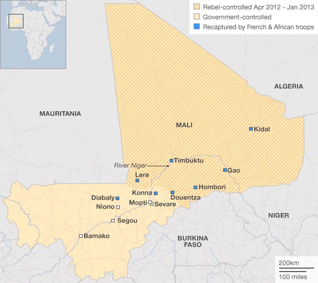 Εκτιμάται ότι σχεδόν 2.000 στρατιώτες από το Τσαντ και τον Νίγηρα βρίσκονται στο Μάλι, την ίδια στιγμή που οι δυνάμεις της Γαλλίας (περίπου 4.000 άνδρες) έχουν αρχίσει να νιώθουν όλο και περισσότερο την αδιόρατη απειλή που κρύβεται στα βουνά κοντά στα σύνορα με την Αλγερία.