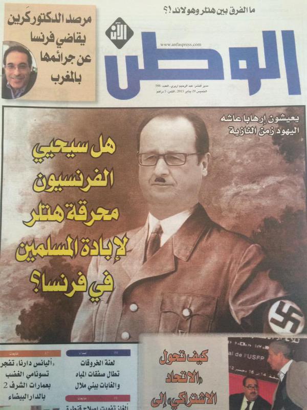Ως Αδόλφο Χίτλερ παρουσίασε στο πρωτοσέλιδό της η εβδομαδιαία μαροκινή εφημερίδα Αλ Βατάν τον πρόεδρο της Γαλλίας Φρανσουά Ολάντ.