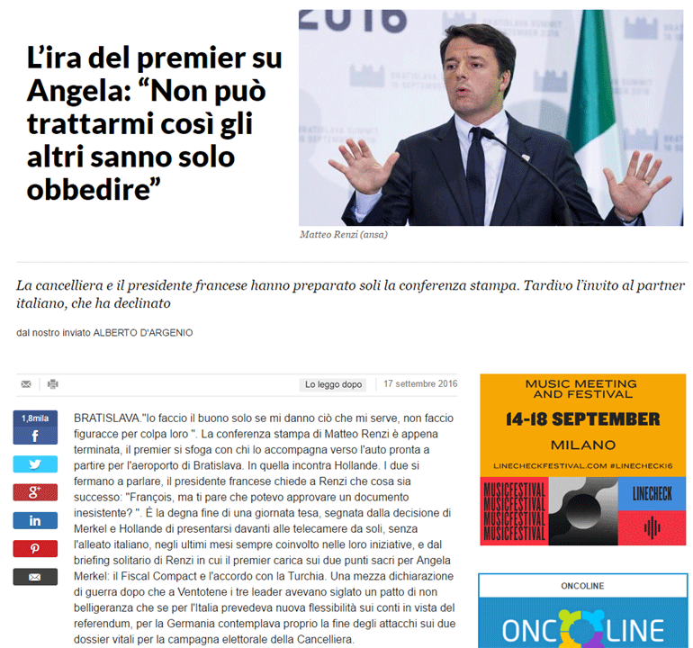 Στο ιταλικό νησί του Βεντοτένε, πριν ένα μήνα, οι Ολάντ, Μέρκελ, Ρέντσι είχαν υπογράψει ένα σύμφωνο μη επίθεσης που για την Ιταλία προέβλεπε μεγαλύτερη ευελιξία ενόψει του δημοψηφίσματος του Νοεμβρίου, ενώ για την Γερμανία περιείχε τον τερματισμό των επιθέσεων σε δυο ζωτικούς τομείς για την προεκλογική εκστρατεία της καγκελαρίου. Ενημερώνοντας, όμως, μόνος του τους δημοσιογράφους, ο κ. Ρέντσι επέμεινε σε δύο σημεία τα οποία η κ. Μέρκελ θεωρεί ότι δεν μπορεί κανείς να τα θίξει: το Δημοσιονομικό Σύμφωνο και την συμφωνία με την Τουρκία για το μεταναστευτικό, καταλήγει η Λα Ρεπούμπλικα.