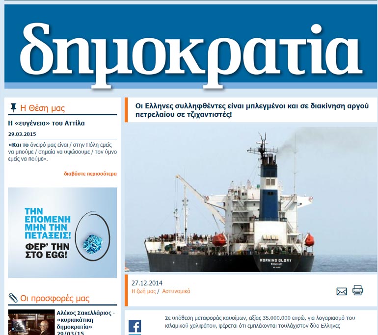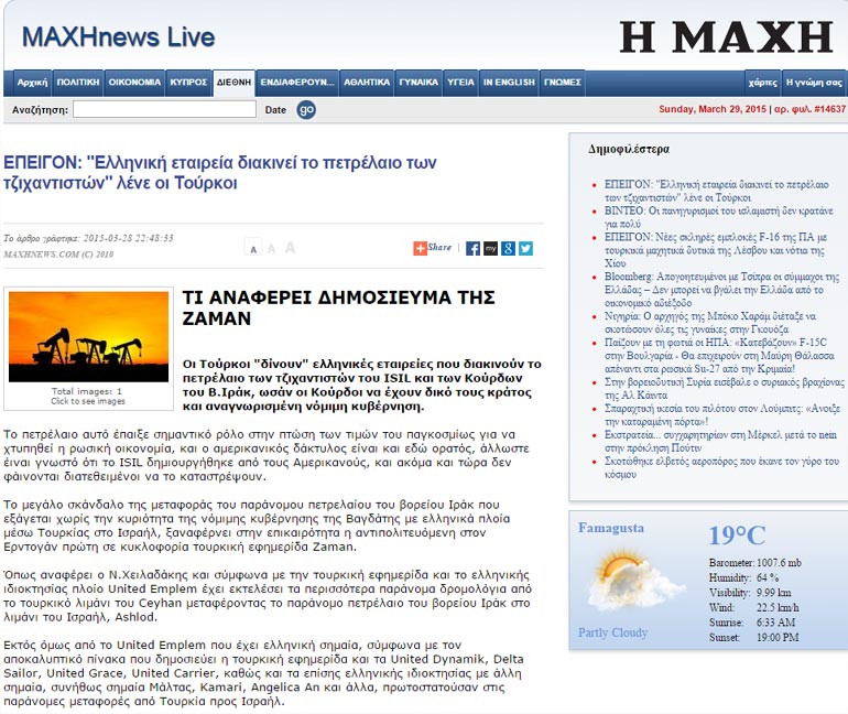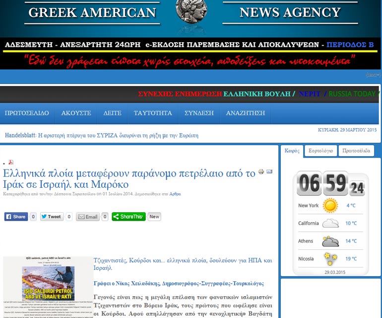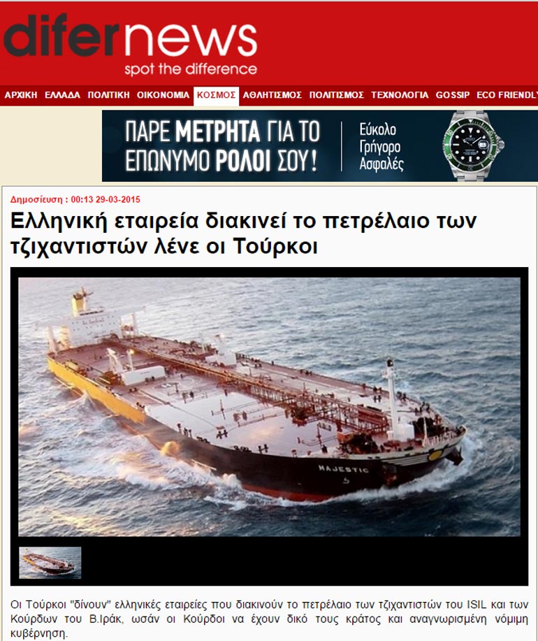 Ελληνόκτητα τάνκερ φέρονται να μεταφέρουν παράνομο πετρέλαιο των τζιχαντιστών του Ιράκ από την Τουρκία στο Ισραήλ, σύμφωνα με ρεπορτάζ της αντιπολιτευόμενης στον Ερντογάν και πρώτης σε κυκλοφορία τουρκικής εφημερίδας «Zaman».