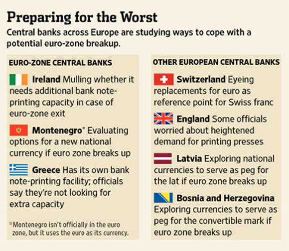 Το εν λόγω δημοσίευμα αναφέρει ότι οι χώρες- μέλη του ευρώ εξετάζουν τις εναλλακτικές επιλογές πολιτικής των Κεντρικών Τραπεζών στην περίπτωση κατάρρευσης της ευρωζώνης και την αναγκαστική επιστροφή στο εθνικό νόμισμα.
