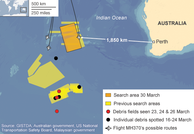 Οι έρευνες εκτείνονται σε μια τεράστια θαλάσσια έκταση 319.000 τετραγωνικών χιλιομέτρων (όση και η επιφάνεια της Νορβηγίας). Ακόμη κι αν καθοριστεί μια μικρότερη περίμετρος για το αμερικανικό sonar, αυτό πρέπει να σύρεται με ταχύτητα 5 χλμ ανά ώρα για να μπορέσει να εντοπίσει τα σήματα.