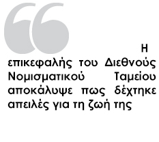 Αποκαλυπτική ήταν σε πρόσφατη συνέντευξή της στους Financial Times η επικεφαλής του Διεθνούς Νομισματικού Ταμείου Κριστίν Λαγκάρντ, η οποία ούτε λίγο ούτε πολύ ξεκαθάρισε πως δέχτηκε απειλές για τη ζωή της όταν μίλησε για τα φαινόμενα φοροδιαφυγής στην Ελλάδα.