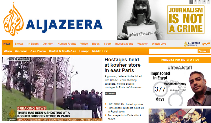 Το Al Jazeera παρακολουθεί τα γεγονότα, ενώ έχει τοποθετήσει μόνιμο γραφικό δίπλα στο λογότυπό του με τίτλο: «Η δημοσιογραφία δεν είναι έγκλημα».