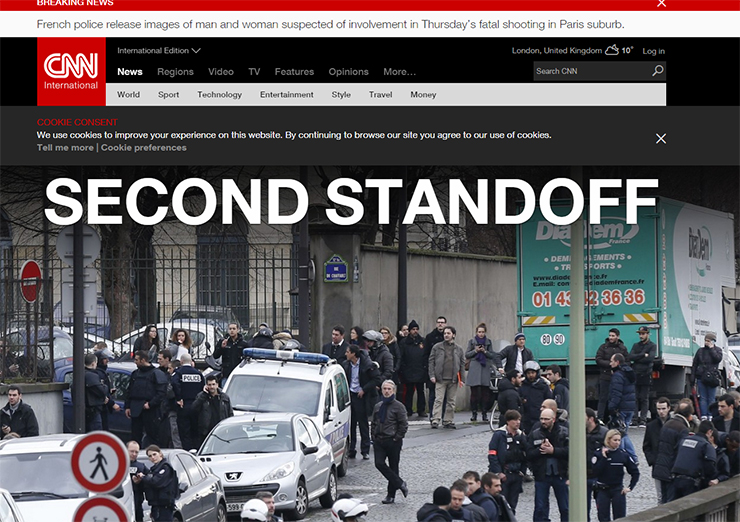 Το CNN έχει αλλάξει εντελώς την πρώτη του σελίδα, που είναι ολοκληρωτικά αφιερωμένη στο Παρίσι, με τον τίτλο «δεύτερος συναγερμός».