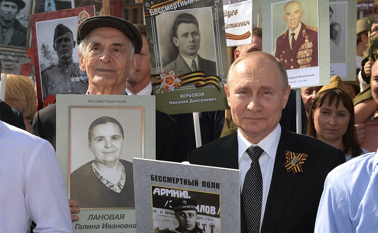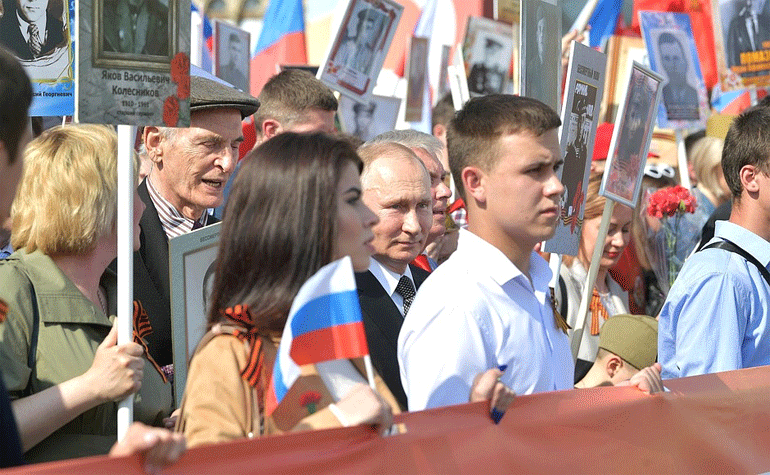 Στην πορεία του «Συντάγματος των Αθανάτων» που πραγματοποιήθηκε στη Μόσχα, συμμετείχε ο Ρώσος πρόεδρος Βλαντίμιρ Πούτιν. Ο Βλαντίμιρ Πούτιν, ο οποίος συμμετείχε στην πορεία του «Συντάγματος των Αθανάτων» για πέμπτη συνεχή χρονιά, διέσχισε μαζί με τους άλλους Ρώσους πολίτες την Κόκκινη Πλατεία κρατώντας την φωτογραφία του πατέρα του που είχε πολεμήσει στον Β’ Παγκόσμιο Πόλεμο.