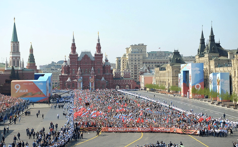 Στις πόλεις της Ρωσίας, την 9η Μαΐου, μετά την καθιερωμένη στρατιωτική παρέλαση για την 74η επέτειο της νίκης επί της ναζιστικής Γερμανίας, πραγματοποιηθηκαν πορείες του «Συντάγματος των Αθανάτων», με τις οποίες οι Ρώσοι πολίτες τιμούν τους συγγενείς και τους οικείους τους που σκοτώθηκαν στα μέτωπα του Μεγάλου Πατριωτικού Πολέμου (όπως αποκαλείται στη Ρωσία ο Β΄ Παγκόσμιος Πόλεμος).