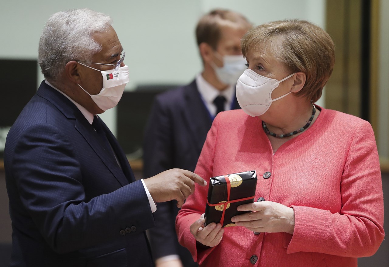 Μάσκα με τη σημαία της χώρας του φόρεσε και ο Πρωθυπουργός της Πορτογαλίας Αντόνιο Κόστα. Στη φωτογραφία ενώ δίνει ένα δώρο στην Άγκελα Μέρκελ που σήμερα γιορτάζει τα γενέθλιά της και γίνεται 66 ετών. Η γερμανίδα καγκελάριος προσήλθε στη Σύνοδο Κορυφής φορώντας μια λευκή μάσκα: