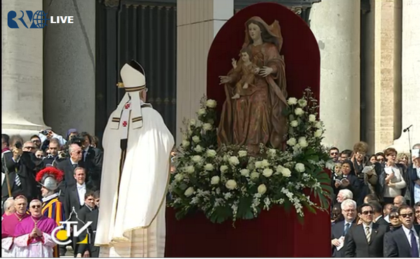 Λίγο πριν τις 10:00 (ώρα Ελλάδος) ο 264ος Ποντίφικας χαιρέτισε από κοντά τους πιστούς, στην πλατεία του Αγίου Πέτρου, από το ειδικό όχημα «Popemobile», το παπικό τζιπ. Στη συνέχεια θα μεταβεί στα σπήλαια του Βατικανού, για να τιμήσει και να προσευχηθεί πάνω από τον τάφο του Αποστόλου Πέτρου. Ο Χόρχε Μάριο Μπεργκόλιο συνοδεύεται από τέσσερις ουνίτες επισκόπους της Καθολικής Εκκλησίας.