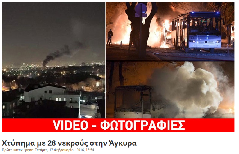 Μεγάλη έκρηξη σημειώθηκε το απόγευμα της Κυριακής σε πάρκο στο κέντρο της Άγκυρας, αφήνοντας πίσω της 37 νεκρούς και 122 τραυματίες, εκ των οποίων οι 16 βρίσκονται σε κρίσιμη κατάσταση. Στις 18.43 εξερράγη παγιδευμένο αυτοκίνητο στην περιοχή Κιζιλάι, όπου βρίσκονται αρκετά κυβερνητικά κτήρια, κοντά σε στάση λεωφορείου.