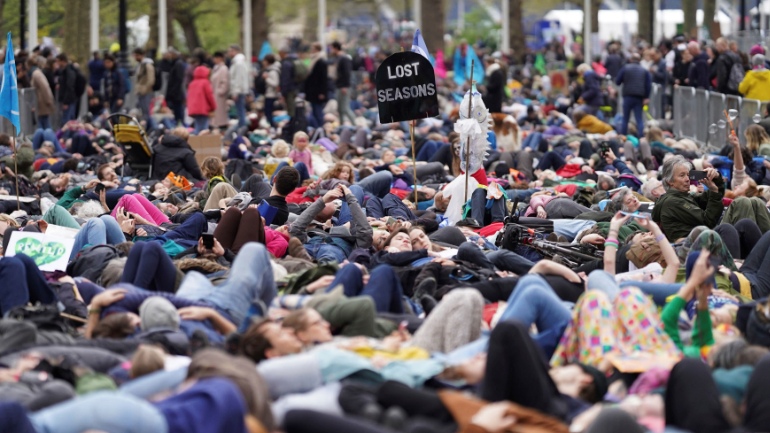 Οικογένειες με μωρά στο καροτσάκι, συνταξιούχοι, έφηβοι, συγκεντρώθηκαν για τη διαδήλωση με την ευκαιρία της Παγκόσμιας Ημέρας της Γης, στο Γουεστμίνστερ, την περιοχή όπου βρίσκεται το Κοινοβούλιο. Δεκάδες άλλες οργανώσεις ανταποκρίθηκαν στο κάλεσμα της XR.