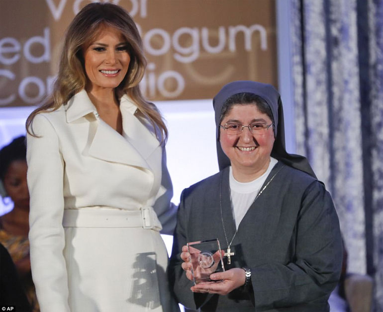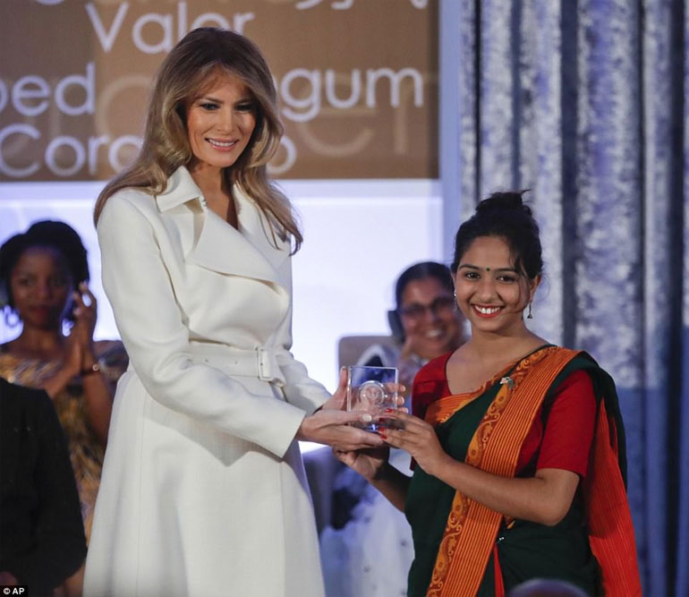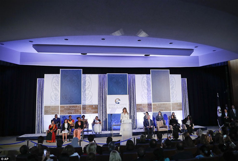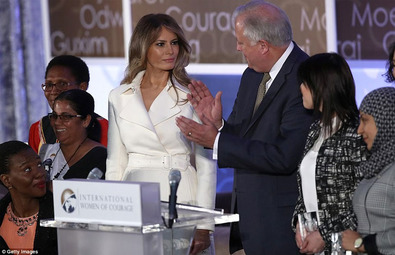 Περιστοιχισμένη από τις 12 από τις 13 τιμηθείσες με το Διεθνές Βραβείο για τις Γενναίες Γυναίκες, η Μελάνια Τραμπ κατήγγειλε τις αδικίες και τις ανισότητες, σε μια ομιλία που έμοιαζε ορισμένες στιγμές να έρχεται σε αντίθεση με τις δηλώσεις του συζύγου της για τη μετανάστευση, ή για το θέμα το οποίο ο ίδιος έχει ορίσει ως την απόλυτη προτεραιότητα της διακυβέρνησής του: «πρώτα η Αμερική».