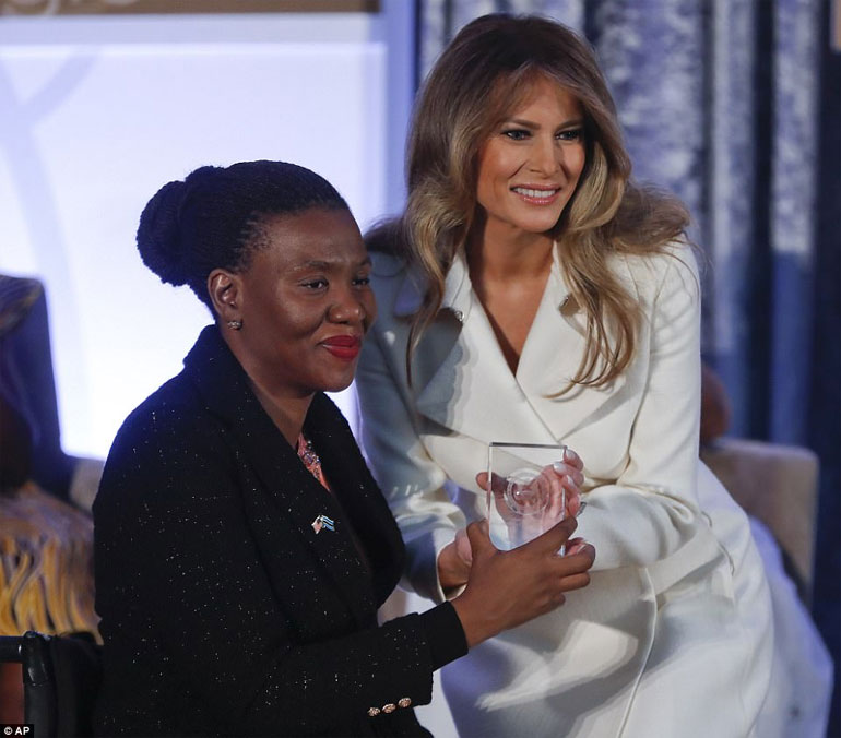 Χαιρετίζοντας την τόλμη των γυναικών που βραβεύθηκαν, η σύζυγος του Αμερικανού προέδρου επισήμανε ότι «γυναίκες όπως αυτές θα ξεκινήσουν την παγκόσμια μάχη εναντίον της απανθρωπιάς».