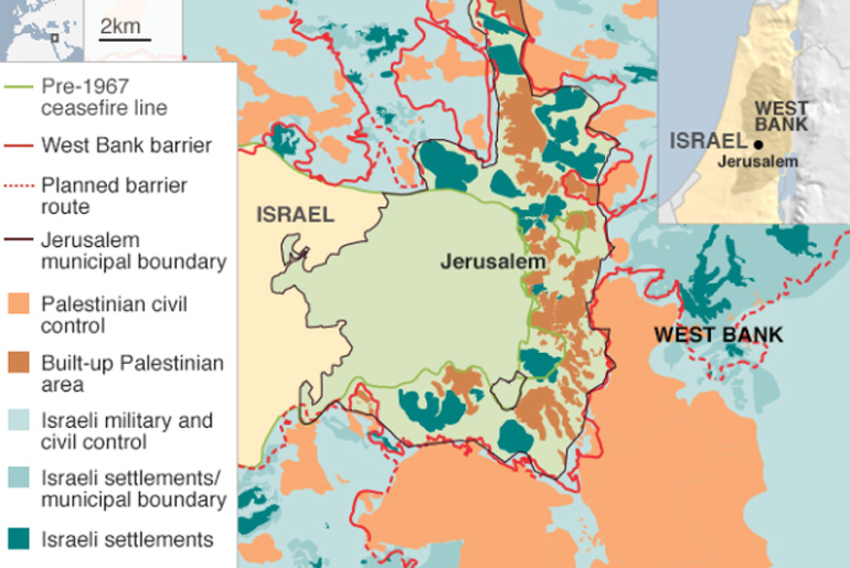 Το Ισραήλ κατέλαβε από τους Παλαιστίνιους το ανατολικό τμήμα της Ιερουσαλήμ στον πόλεμο του 1967, ωστόσο οι τελευταίοι θεωρούν το τμήμα αυτό μελλοντική πρωτεύουσα του κράτους τους.