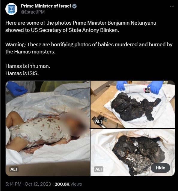 Σοκ προκαλούν οι φωτογραφίες που έδειξε ο Μπενιαμίν Νετανιάχου στον Αμερικανό ΥΠΕΞ, Άντονι Μπλίνκεν από απανθρακωμένα και σφαγμένα βρέφη, τα οποία έπεσαν θύματα των μαχητών της Χαμάς. Οι φωτογραφίες αναρτήθηκαν μάλιστα στον επίσημο λογαριασμό του πρωθυπουργού του Ισραήλ στο Twitter και είναι πραγματικά φρικιαστικές.