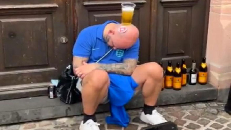 Ένας μεθυσμένος Άγγλος οπαδός κοιμόταν… όρθιος σε πεζούλι πριν τον αγώνα των «Τριών Λιονταριών» κόντρα στη Δανία για τη δεύτερη αγωνιστική των ομίλων του Ευρωπαϊκού πρωταθλήματος και κάποιοι συμπατριώτες του του στερέωσαν μία μπύρα στο κεφάλι.