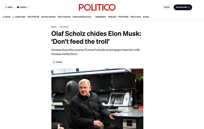 «Υπάρχουν πολλοί στα μέσα κοινωνικής δικτύωσης που θέλουν να τραβήξουν την προσοχή με εντυπωσιακά συνθήματα. Ο κανόνας είναι: μην ταΐζετε το τρολ» ανέφερε χαρακτηριστικά ο Σολτς σε συνέντευξή του στο γερμανικό εβδομαδιαίο περιοδικό Stern, που δημοσιεύθηκε το Σάββατο, 4 Ιανουαρίου. «Δεν πιστεύω ότι πρέπει να προσπαθήσουμε να κερδίσουμε την εύνοια του κ. Μασκ. Ευχαρίστως αφήνω κάτι τέτοιο σε άλλους».