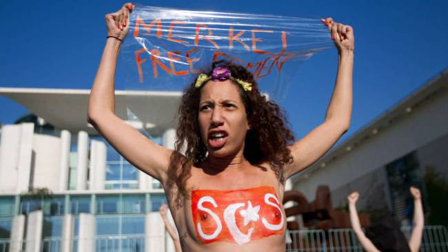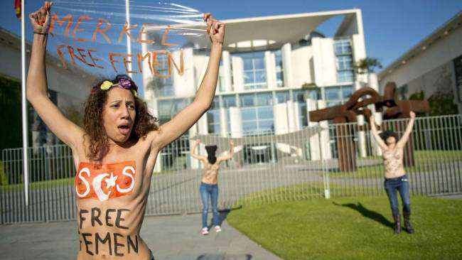 Τρία μέλη της ακτιβιστικής οργάνωσης FEMEN επιχείρησαν να εισβάλλουν στην Καγκελαρία – χωρίς να είναι γνωστό αν η Μέρκελ βρισκόταν εκεί – όμως η διαμαρτυρία τους έλαβε τέλος άδοξα στον προαύλιο χώρο.