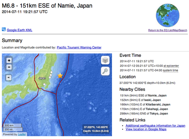 Ιαπωνία: Σεισμός 6,8 βαθμών 165 χλμ. ανατολικά της Χονσού, προειδοποίηση για τσουνάμι, Πρώτη καταχώρηση: Παρασκευή, 11 Ιουλίου 2014, 22:44