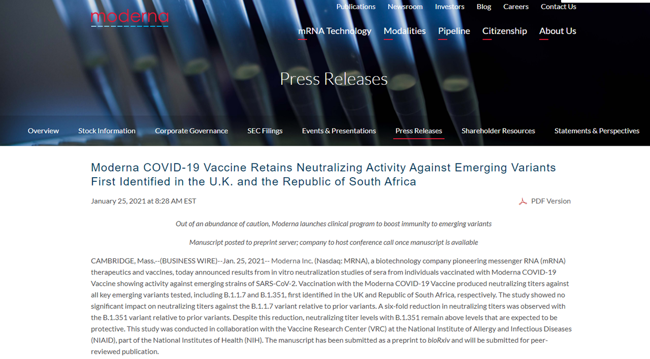 Το εμβόλιο της Moderna είναι αποτελεσματικό έναντι των νέων παραλλαγών του Covid-19 που έχουν εμφανιστεί στη Βρετανία και τη Νότια Αφρική, ανακοίνωσε η εταιρεία τη Δευτέρα. Φαίνεται όμως ότι είναι λιγότερο προστατευτικό έναντι της παραλλαγής που ανακαλύφθηκε στη Νότια Αφρική, και έτσι η εταιρεία αναπτύσσει μια νέα μορφή του εμβολίου που θα μπορούσε να χρησιμοποιηθεί ως ενισχυτικό εμβόλιο κατά του ιού.
