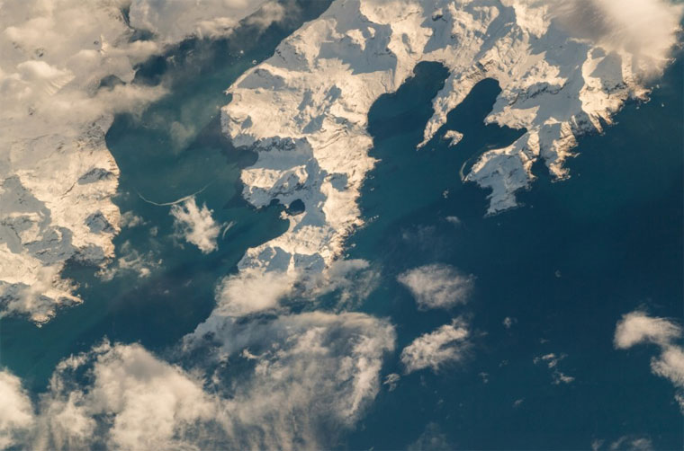 Από το διάστημα διακρίνεται επίσης το Βόρειο Σέλας, το πρασινωπό φως γύρω από τους μαγνητικούς πόλους της Γης, τη βόρεια Σκανδιναβία, την Ισλανδία, τον Καναδά και την Αλάσκα.