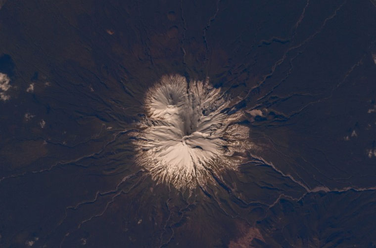 Μία άλλη εντυπωσιακή φωτογραφία του αστροναύτη που δημοσιεύει η γερμανική εφημερίδα «Suddeutsche zeitung» είναι από το ηφαίστειο Ταναράκι στη Νέα Ζηλανδία. Το ηφαίστειο βρίσκεται σε υψόμετρο 2.518 μέτρων στο Βόρειο Νησί και ο κρατήρας του συχνά καλύπτεται από χιόνι, όπως τον φωτογράφισε ο αστροναύτης.