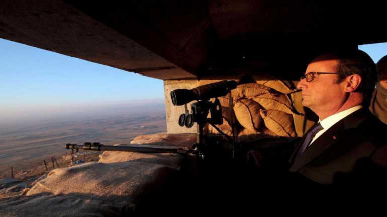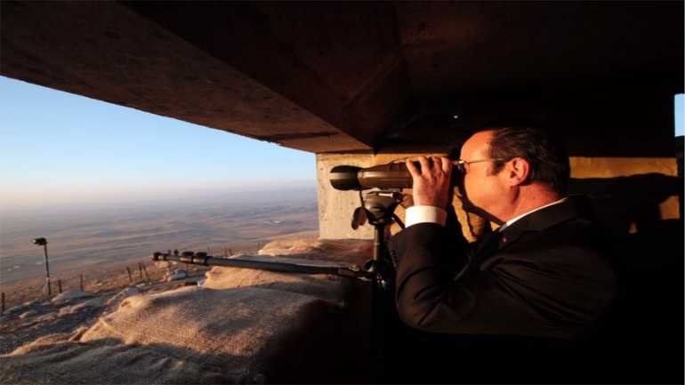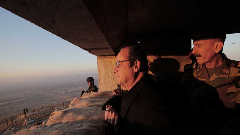 Από τη βραχώδη κορυφογραμμή με θέα την πεδιάδα της Νινευή, ο Γάλλος Πρόεδρος «σαρώνει» το τοπίο με τα κιάλια. Βρίσκεται σε ένα φυλάκιο των Peshmerga (κούρδοι μαχητές), δεκαπέντε χιλιόμετρα μακριά, από το κέντρο της πόλης της Μοσούλης, όπου υψώνεται το τελευταίο μεγάλο οχυρό της Daech, με τον πρόεδρο του ιρακινού αυτόνομου Κουρδιστάν, Μασούντ Μπαρζανί.