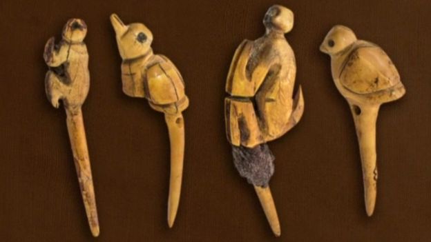 Συγκεκριμένα, στον τάφο της γυναίκας βρέθηκαν -μεταξύ άλλων- μικρά γλυπτά με μορφές πουλιών ή μαϊμούδων, καθώς και ένα κολιέ από όστρακα.