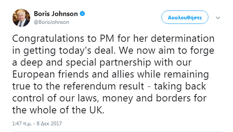 «Συγχαρητήρια στην πρωθυπουργό για την αποφασιστικότητά της να επιτύχει τη σημερινή συμφωνία», έγραψε ο Τζόνσον στο Twitter.