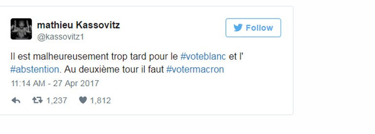 Από την πλευρά του ο ηθοποιός και σκηνοθέτης, Ματιέ Κάσοβιτς, κάλεσε τους πολίτες να ψηφίσουν τον Μακρόν γράφοντας στον προσωπικό του λογαριασμό στοTwitter: «Είναι πολύ αργά για να ψηφίσουμε #voteblanc (λευκό) και να κάνουμε #abstention (αποχή). Στο δεύτερο γύρο θα πρέπει να #votermacron (ψηφίσουμε Macron)».