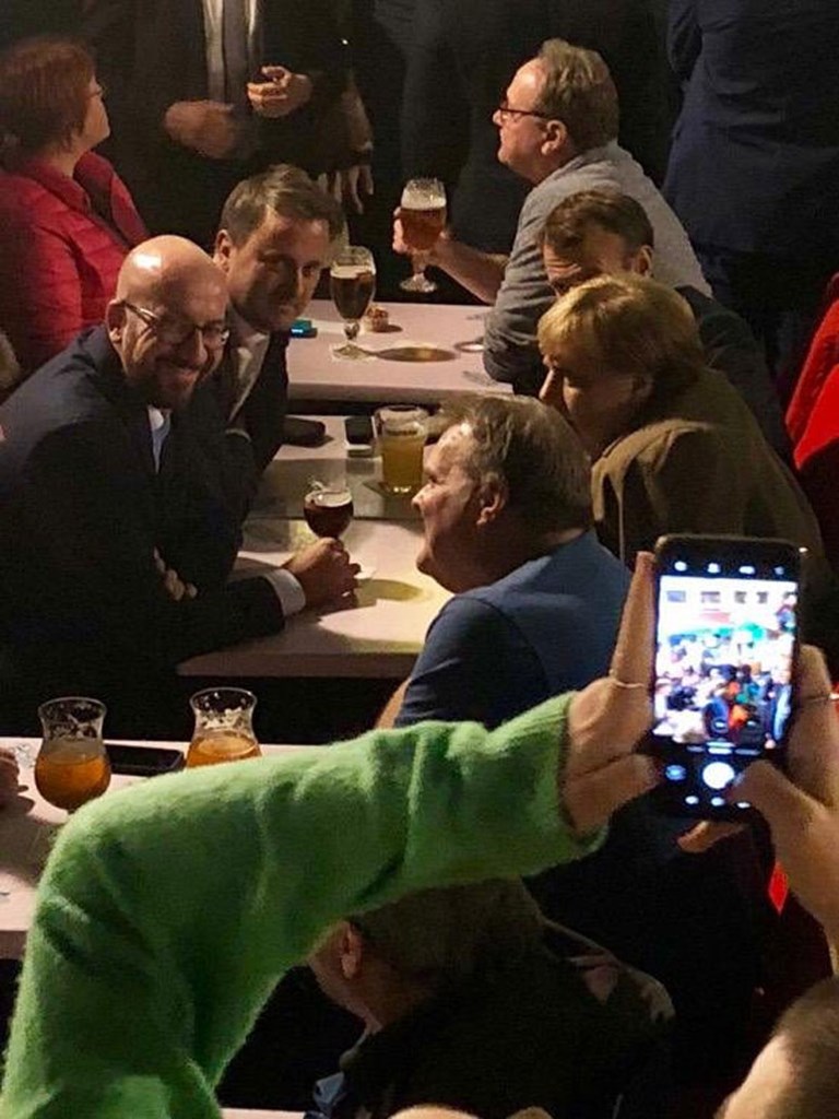 Η Άνγκελα Μέρκελ, ο Εμανουέλ Μακρόν και οι ηγέτες του Βελγίου και του Λουξεμβούργου έκαναν αργά χθες το βράδυ τους θαμώνες να σαστίσουν μπαίνοντας σ’ ένα μπαρ των Βρυξελλών για μπύρα και τηγανιτές πατάτες μετά τη βραδινή σύνοδο κορυφής για το Brexit με τη πρωθυπουργό της Βρετανίας Τερέζα Μέι.