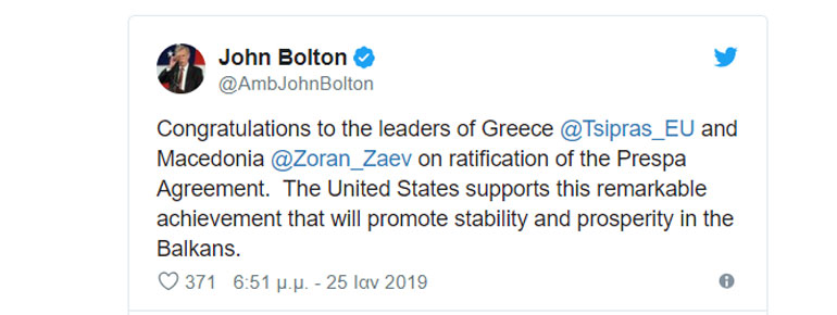 Συγχαρητήριο μήνυμα για την επικύρωση της Συμφωνίας των Πρεσπών έστειλε ο σύμβουλος εθνικής ασφαλείας του Λευκού Οίκου, Τζον Μπόλτον, με ανάρτηση στον προσωπικό λογαριασμό του στο Twitter.