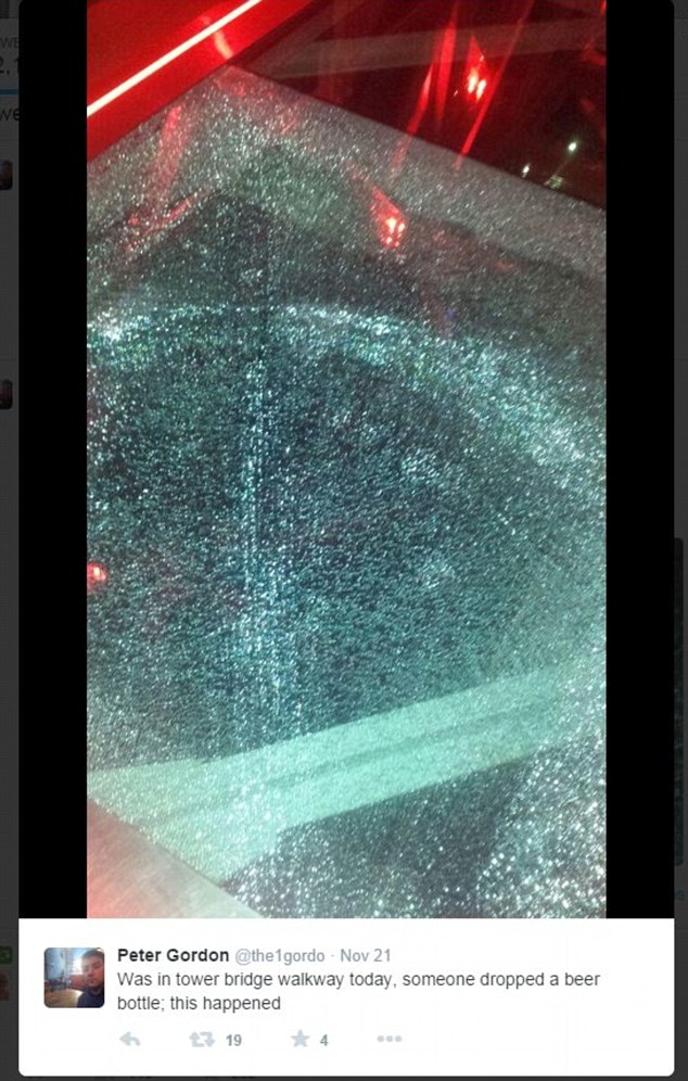 Όπως αναφέρει σχετικό δημοσίευμα της Daily Mail, το δάπεδο του γνωστού «διαφανούς διαδρόμου» που είναι υπερυψωμένος πάνω από τον ποταμό Τάμεση αποτελείται από έξι υαλοπίνακες βάρους μισού τόνου ο καθένας. Σε έναν από αυτόν προκλήθηκε μια ρωγμή όταν έσπασε πάνω του ένα μπουκάλι μπύρας, ωστόσο μεγαλύτερη ζημιά επήλθε όταν στο ίδιο σημείο πάτησε μια περαστική η οποία φορούσε τακούνια. Ο υαλοπίνακας ράγισε τελείως και πρέπει να αντικατασταθεί.