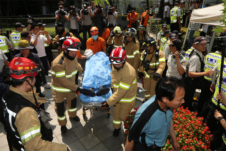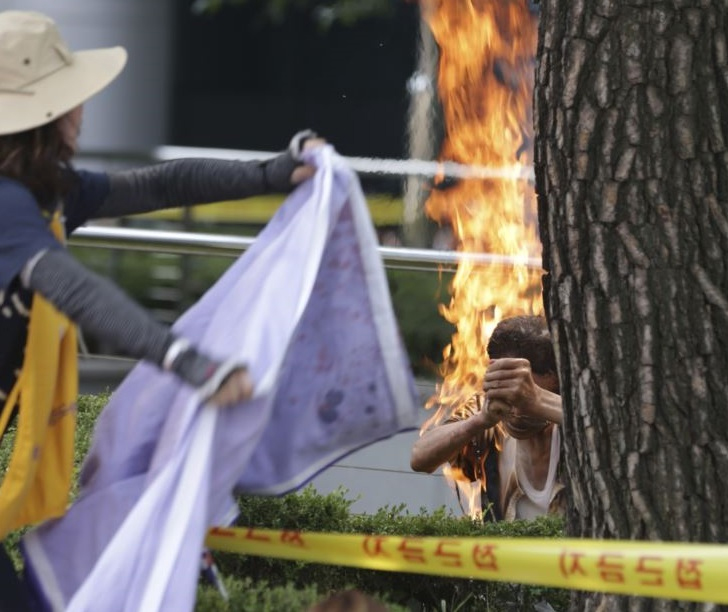 Ο τραυματίας, ονόματι Choi Yeon-yeol, μεταφέρθηκε με ασθενοφόρο σε νοσοκομείο της νοτιοκορεατικής πρωτεύουσας. Όπως φαίνεται και στο video που ακολουθεί, διαδηλωτές με κουβέρτες προσπάθησαν να σβήσουν άμεσα στις φλόγες που είχαν τυλίξει τον ηλικιωμένο.