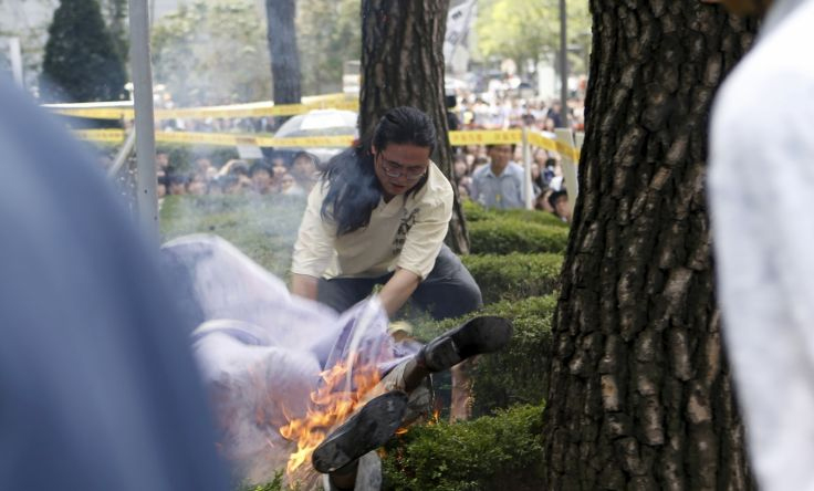 Η διαδήλωση πραγματοποιήθηκε έξω από την πρεσβεία της Ιαπωνίας, ελάχιστες ημέρες πριν από τη συμπλήρωση των 70 ετών από την ήττα της ασιατικής χώρας στον Β’ Παγκόσμιο Πόλεμο που σήμανε και το τέλος της ιαπωνικής κατοχής στην Κορεατική (1910-1945). Περίπου 2.000 άνθρωποι συμμετείχαν στη διαδήλωση.