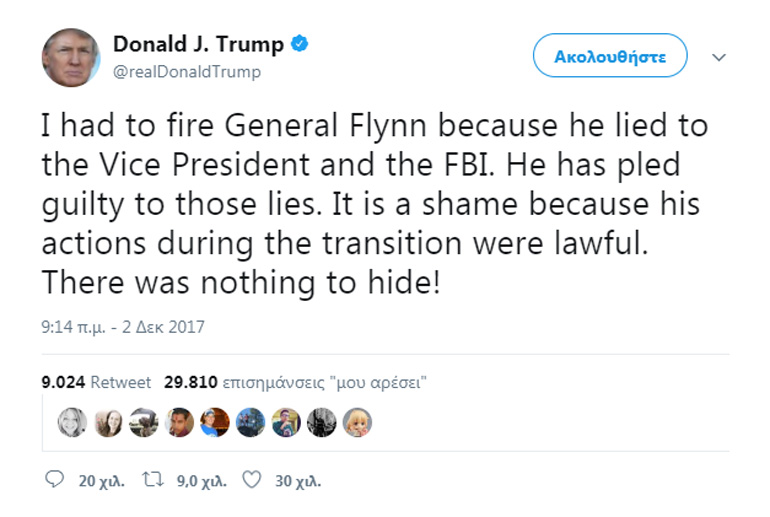 «Αναγκάστηκα να αποπέμψω τον στρατηγό Φλιν διότι είπε ψέματα στον αντιπρόεδρο και το FBI. Ομολόγησε την ενοχή του για τα ψεύδη αυτά. Είναι θλιβερό, διότι οι πράξεις του κατά την περίοδο μετάβασης ήσαν νόμιμες. Δεν είχε τίποτε να κρύψει!», έγραψε στο Twitter πριν από λίγο ο Τραμπ, κάνοντας για δεύτερη φορά από το πρωί αναφορά στην εν δυνάμει εκρηκτική έρευνα που αγγίζει πλέον τον στενό κύκλο του περιβάλλοντός του.