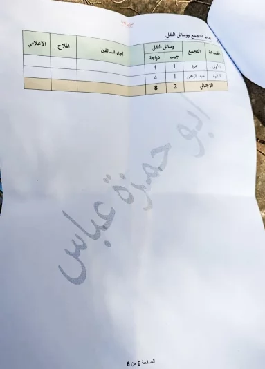 «Group 1 Μετακίνηση από Χάμζα: Ενα τσιπ και τέσσερις μοτοσικλέτες. Γκρουπ 2 Αμπντέλ Ραχμάν: ένα τζιπ και τέσσερις μοτοσικλέτες. Σχέδιο απόστασης μεταξύ των ομάδων, 50 μέτρα ανά γκρουπ» αναφέρουν.