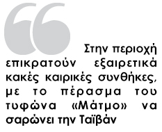 Στην περιοχή επικρατούν εξαιρετικά κακές καιρικές συνθήκες, με το πέρασμα του τυφώνα «Μάτμο» να σαρώνει την Ταϊβάν.