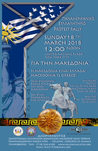 Η Ομοσπονδία Ελληνικών Σωματείων Νέας Υόρκης σε συνεργασία με την ΠΑΜΜΑΚΕΔΟΝΙΚΗ Ένωση Αμερικής και το νεοσύστατο τριτοβάθμιο όργανο HELLENIC CONGRESS of AMERICA που εκπροσωπεί 21 Ομοσπονδίες ανά τις ΗΠΑ, αναλογιζόμενοι την ιστορική ευθύνη που έχει η ομογένεια συνεχίζουμε την προσπάθεια μας για την αποκατάσταση της ιστορικής αλήθειας για την ΜΑΚΕΔΟΝΙΑ!
