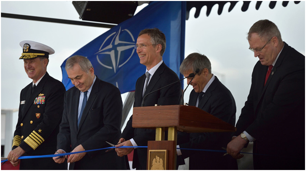 Από αριστερά: Ο αμερικάνος ναύαρχος διοικητής των ΝΑΤΟϊκών ναυτικών δυνάμεων Ευρώπης MarkE.Ferguson, ο πρόεδρος της Ρουμανίας LazarComanescu, ο γγ του ΝΑΤΟJensStoltenberg, ο Ρουμάνος πρωθυπουργόςDacianCiolos και ο αμερικάνος υφυπουργός Άμυνας DefenseRobertO’Workκόβουν την κορδέλα των εγκαινίων της νέα ΝΑΤΟϊκής πυραυλικής βάσης.