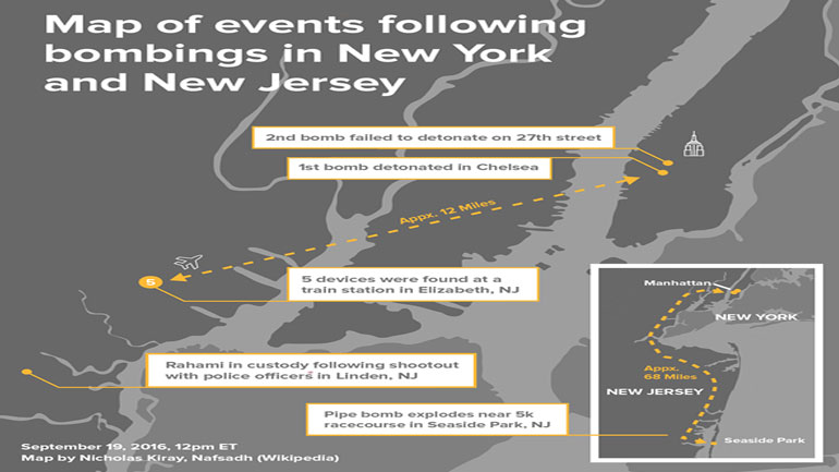 Ο Αμάντ Κχαν Ραχαμί, ο κύριος ύποπτος για τρεις ξεχωριστές βομβιστικές επιθέσεις στη Νέα Υόρκη και το Νιου Τζέρσεϊ, έχει τεθεί υπό κράτηση στη Λίντεν (πόλη στη νοτιοανατολική πλευρά, του Νιού Τζέρσεϊ των Ηνωμένων Πολιτειών) μετά από ανταλλαγή πυροβολισμών με την αστυνομία, τη Δευτέρα το απόγευμα.