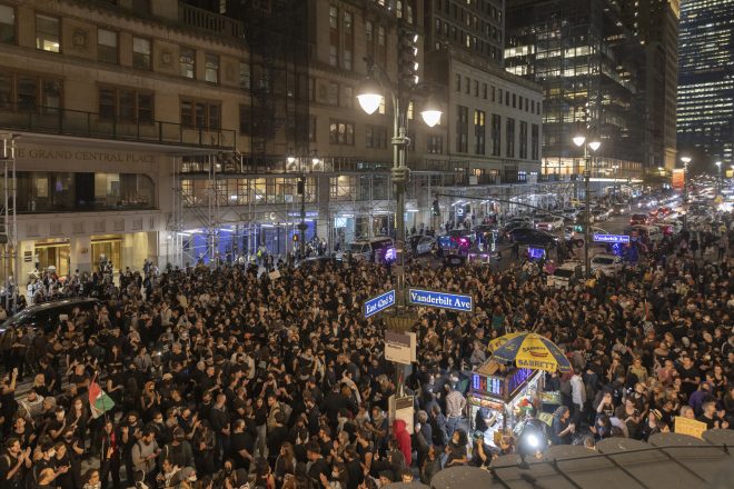Η αστυνομία δεν παρέχει στοιχεία για τον αριθμό των συμμετεχόντων στις διαδηλώσεις, αλλά μέσα ενημέρωσης της Νέας Υόρκης και το AFPTV υπολόγισαν το πλήθος σε “χιλιάδες” διαδηλωτές που κρατούσαν πανό με τα συνθήματα “Ελεύθερη Παλαιστίνη” και “Με όλα τα απαραίτητα μέσα”.