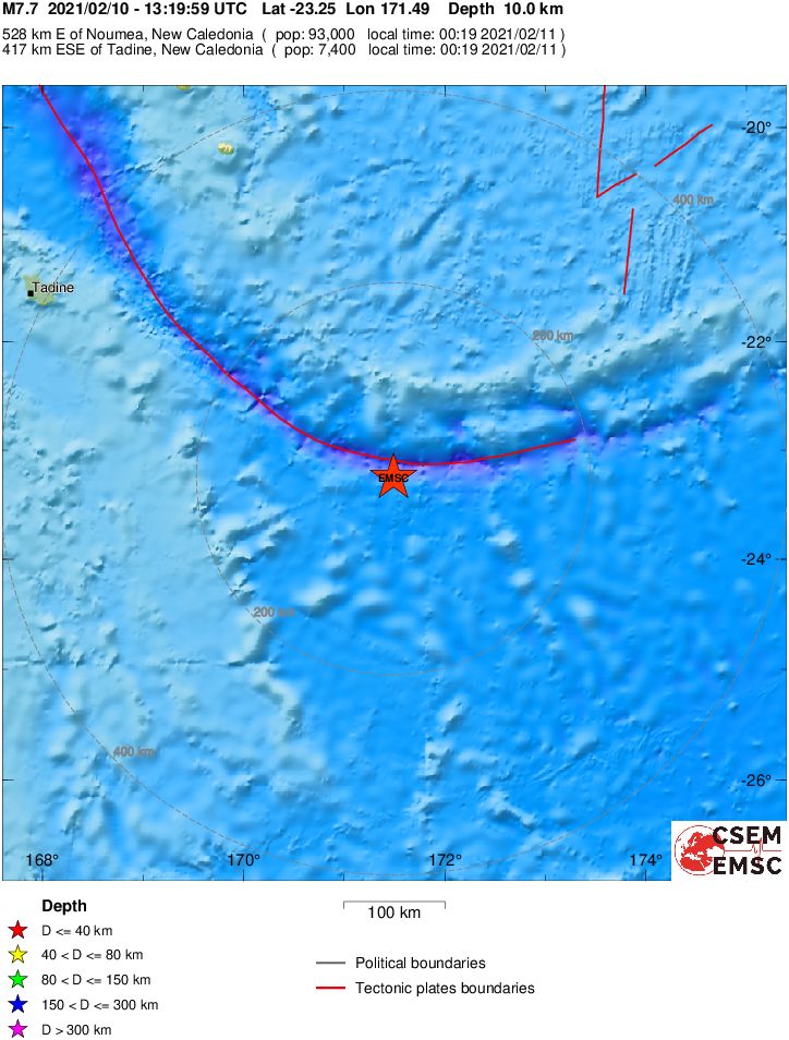 Η δόνηση σημειώθηκε σε θαλάσσιο χώρο, με εστιακό βάθος 10 χλμ. και επίκεντρο στα 424 χλμ. ανατολικά της πόλης Tadine στη Νέα Καληδονία.
