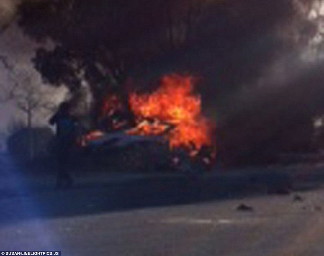 Εικόνες από τον τόπο του δυστυχήματος δείχνουν το αυτοκίνητο να έχει μετατραπεί σε μια άμορφη μάζα σιδερικών, την ίδια στιγμή που αποσβολωμένοι πυροσβέστες στέκουν κοντά κατεστραμμένο όχημα, μην μπορώντας να πιστέψουν στα μάτια τους.